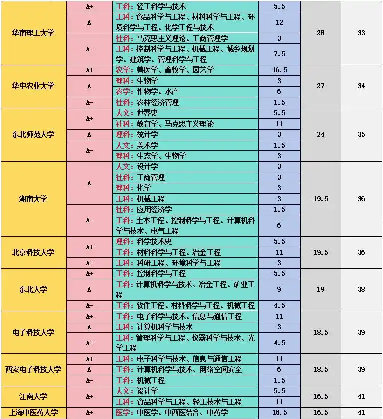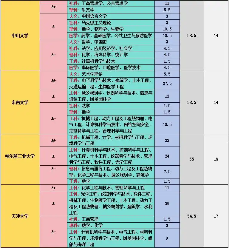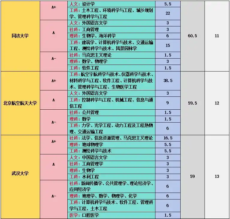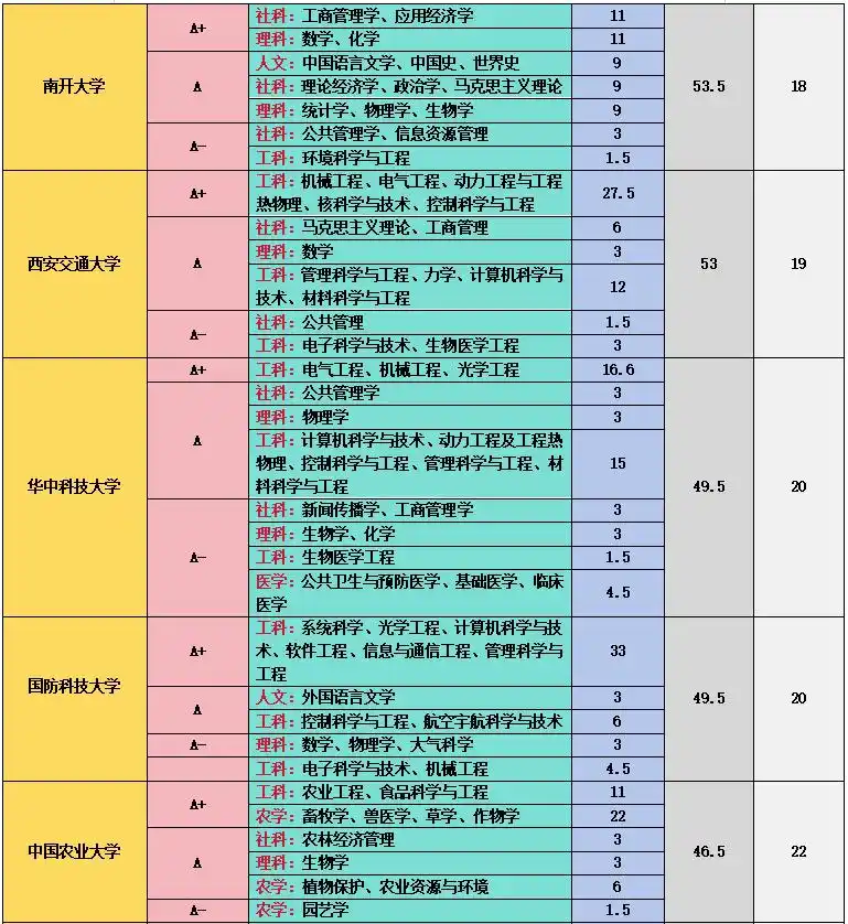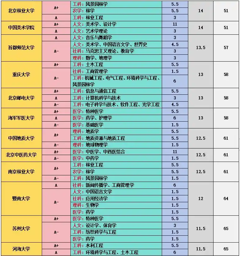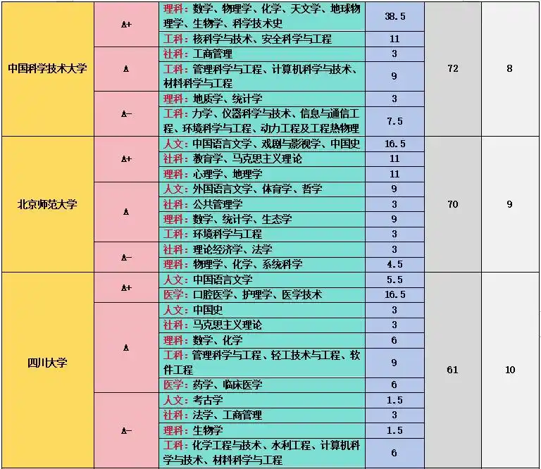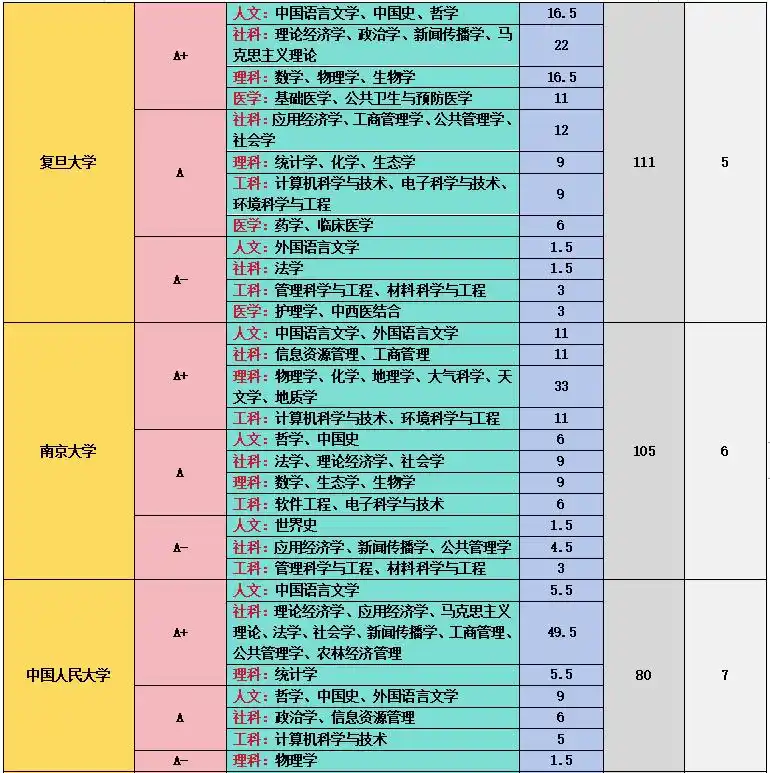 上海交通大学在工科和医学领域成绩斐然,11 个 A + 学科中,管理科学与工程、计算机科学与技术、机械工程、材料科学与技术等工科专业实力强劲,临床医学、基础医学、口腔医学等医学专业也表现出色,其医学教育和科研水平在国内名列前茅 。中国科学技术大学在理科领域优势突出,数学、物理学、化学、生物学、科学技术史、天文学、地球物理学、核科学与技术等 9 个学科获得 A+,在基础科学研究方面取得了众多突破性成果,培养了大批优秀的科研人才 。中国人民大学在人文社科领域独占鳌头,中国语言文学、理论经济学、应用经济学、法学、马克思主义理论、社会学、新闻传播学、工商管理、公共管理、农林经济管理、统计学等 11 个学科获评 A+,是人文社科领域的学术重镇 。