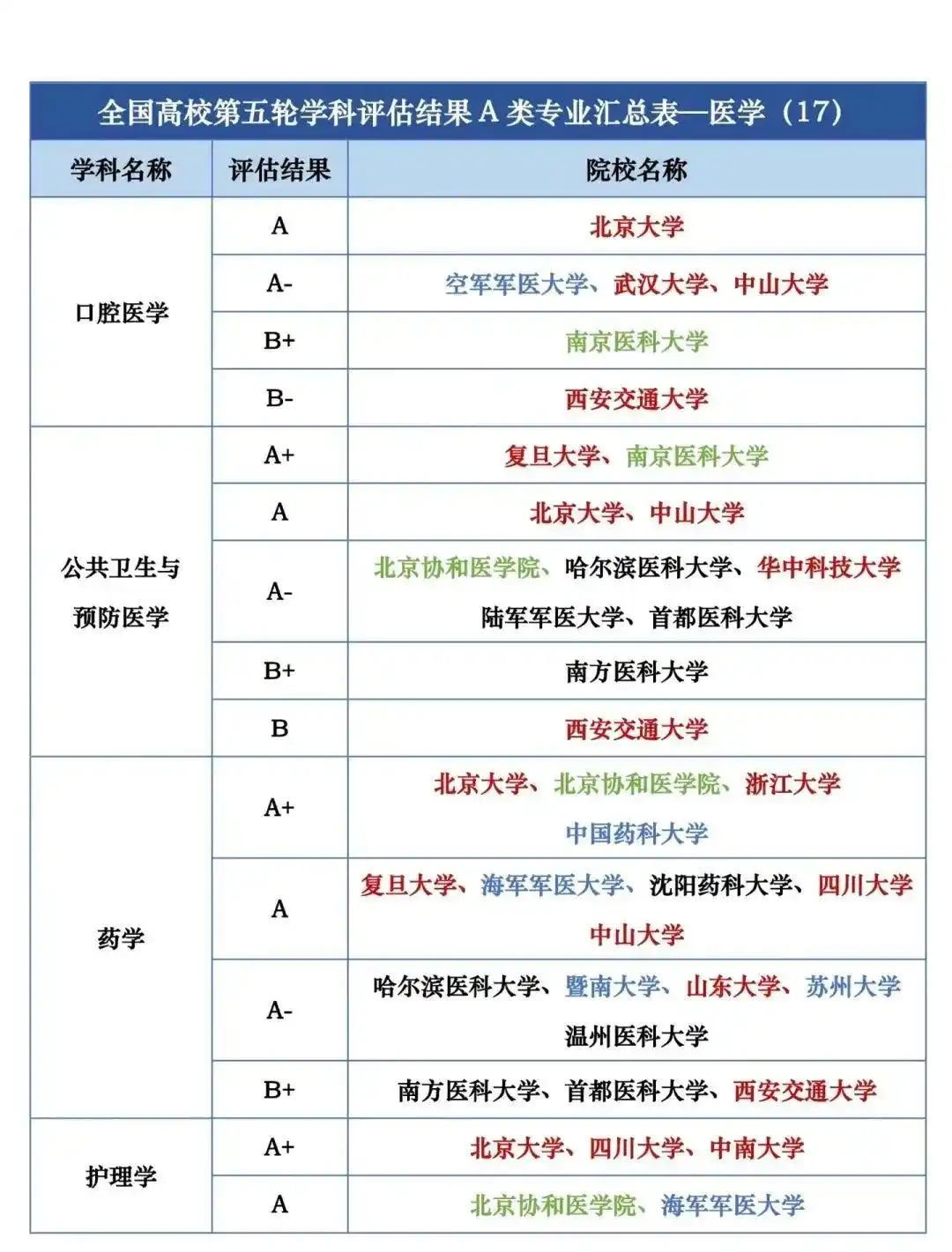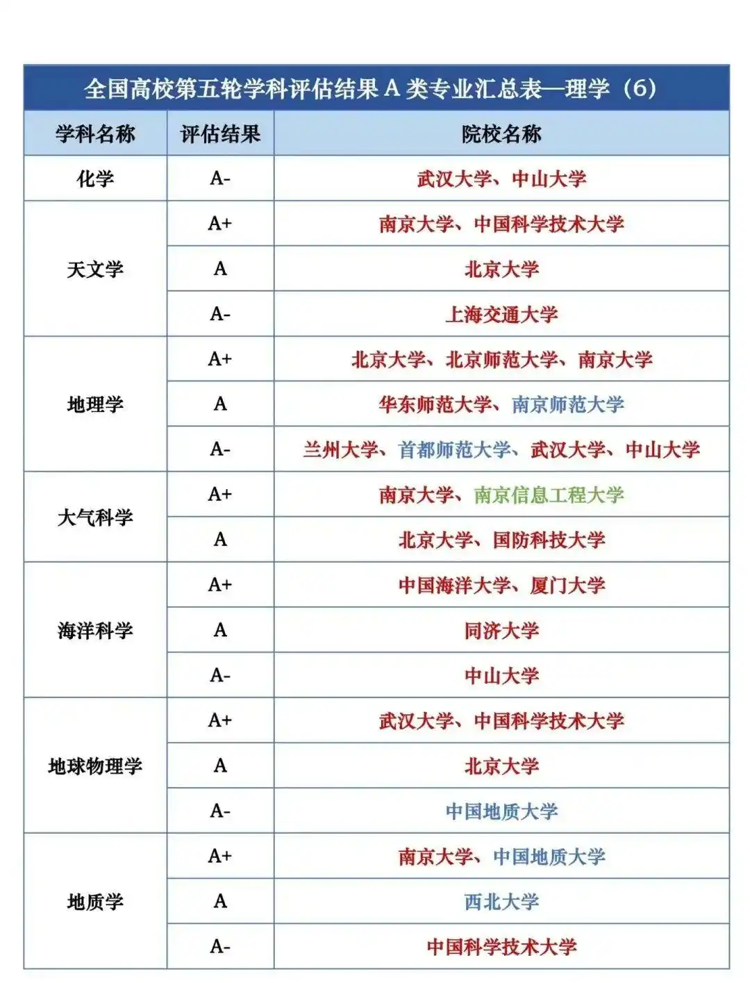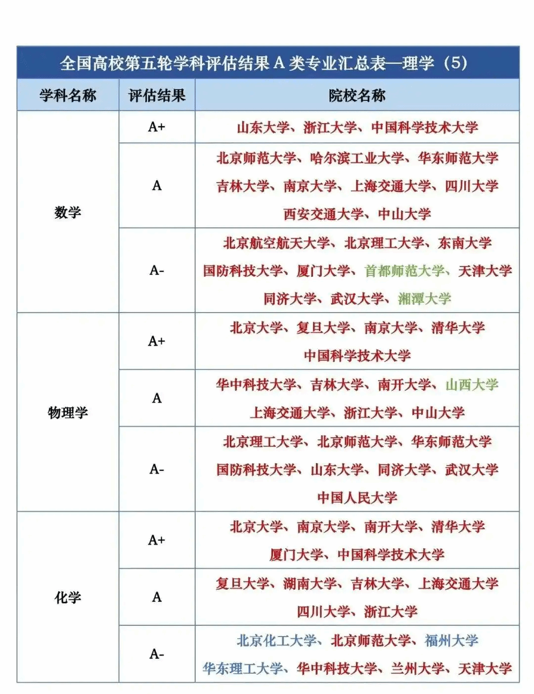 全国第五轮学科评估结果A类按照学校汇总