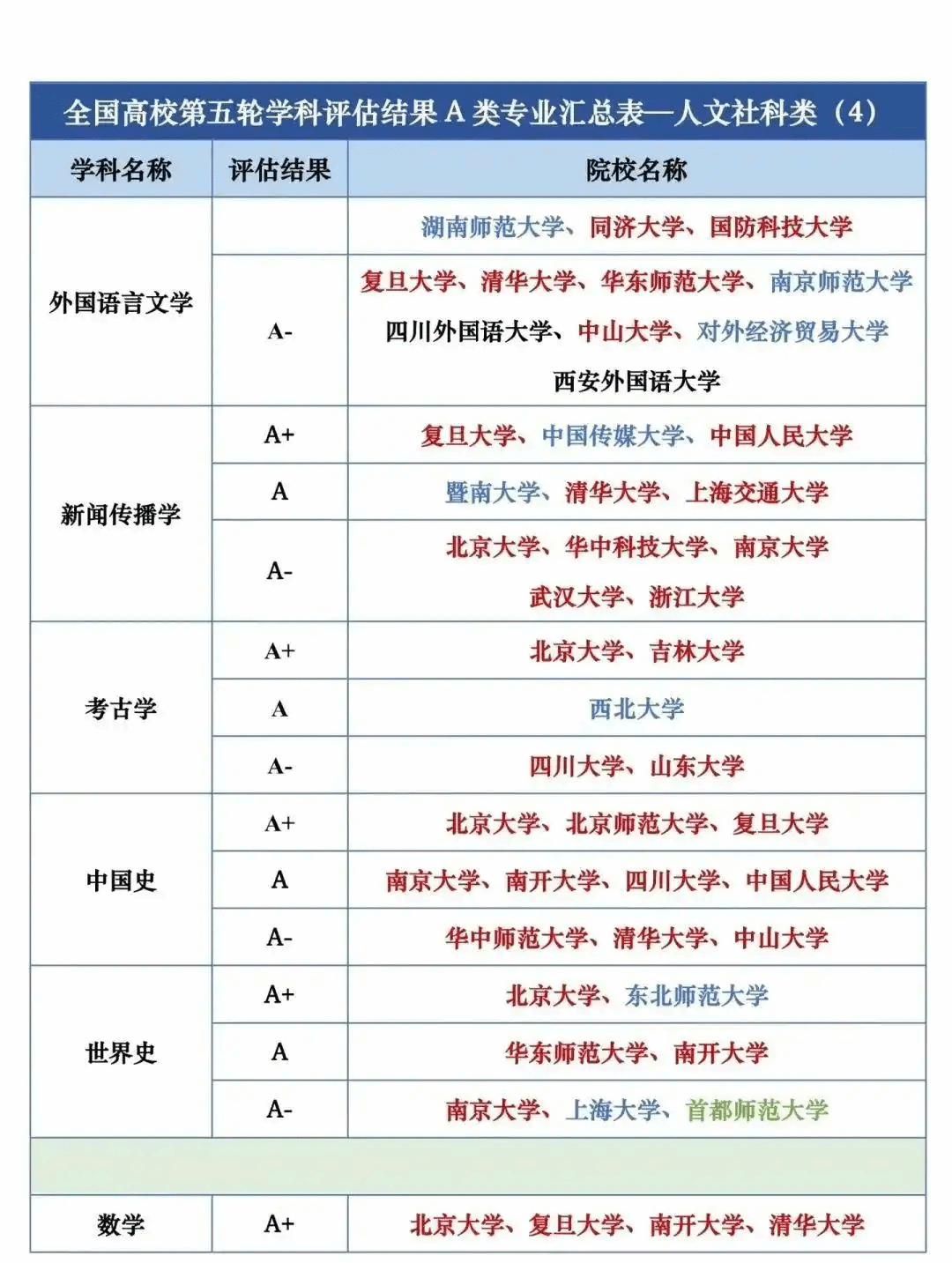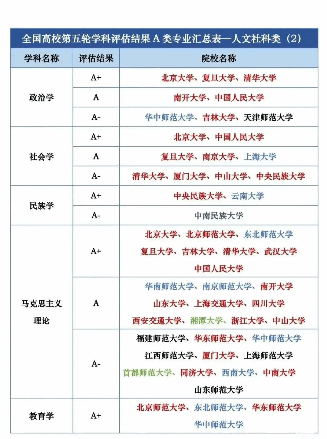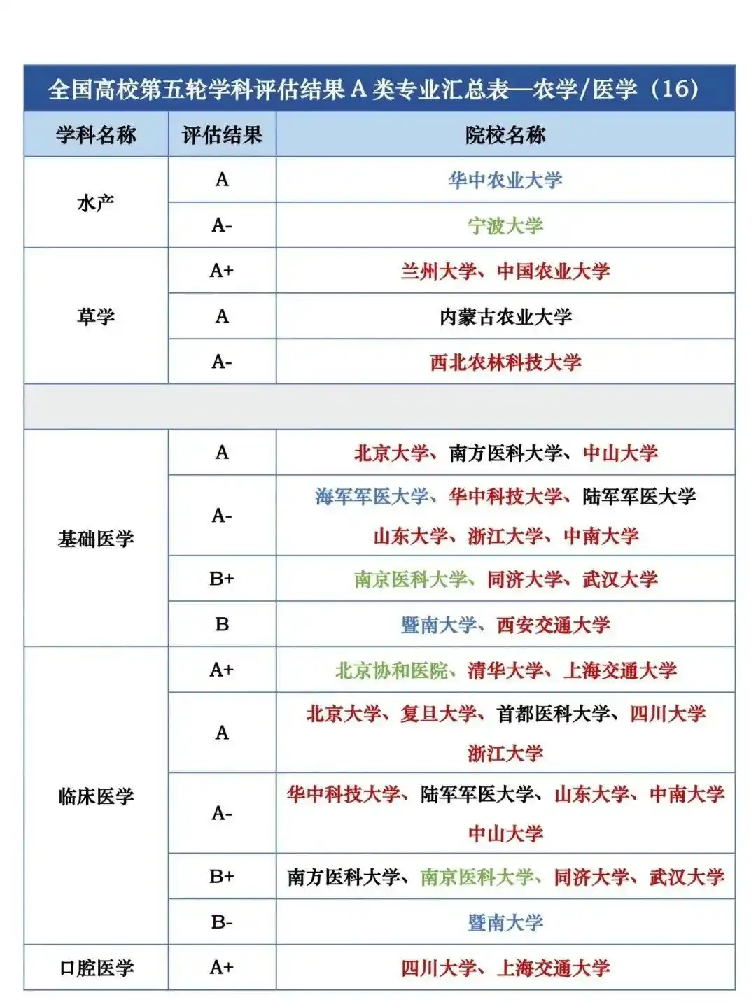 全国第五轮学科评估结果A类按照学校汇总