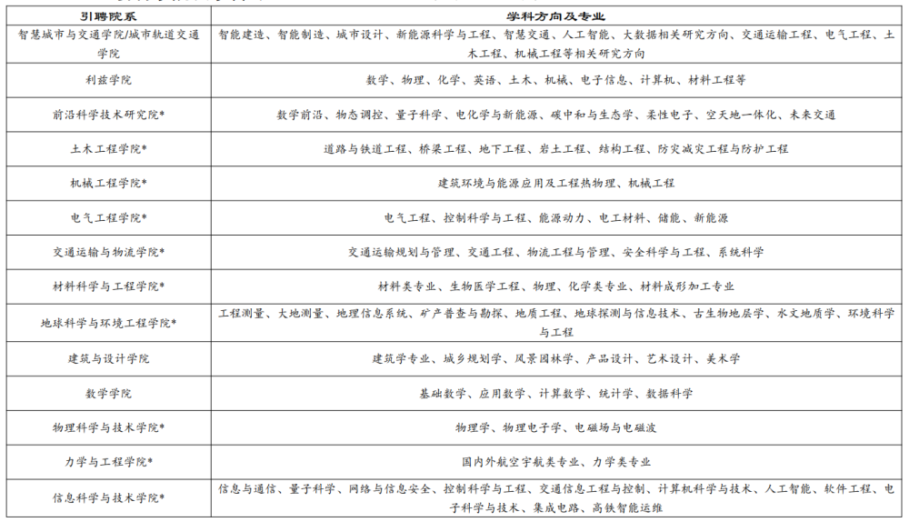 三、引聘学院及学科专业(*为交通运输一流学科建设支持学院)