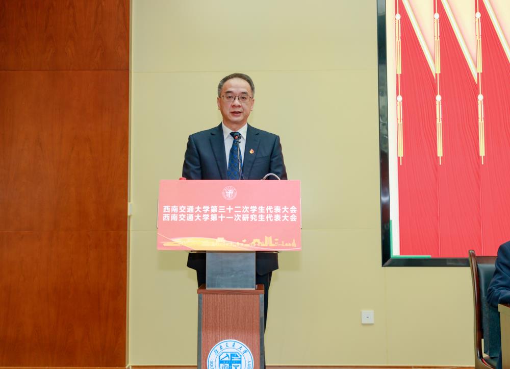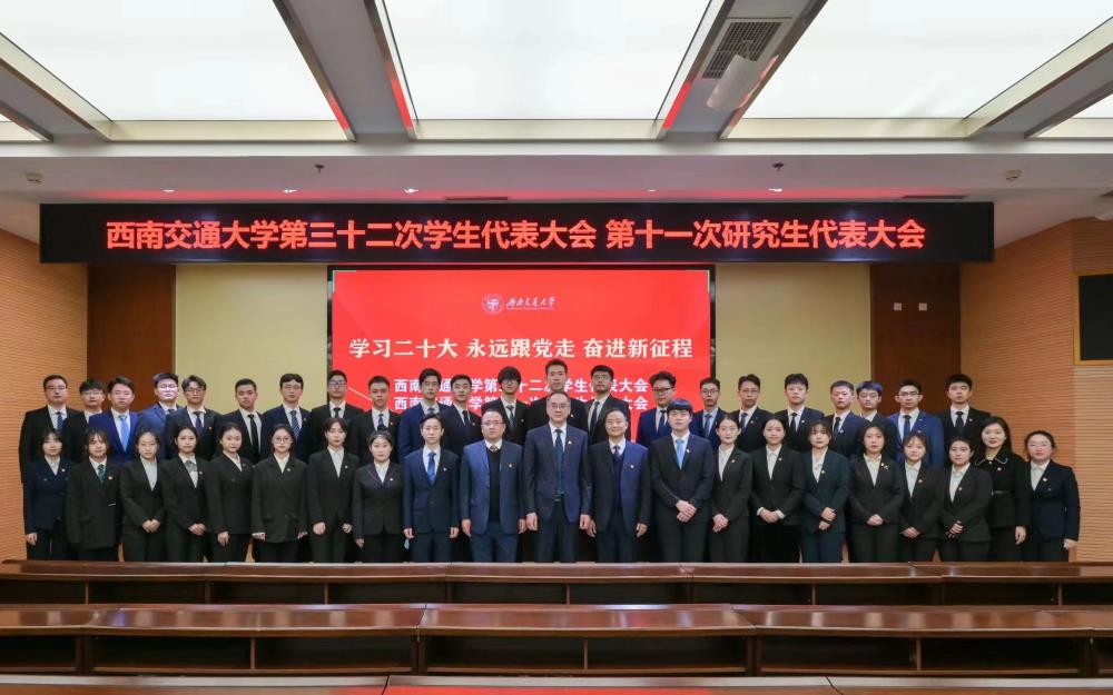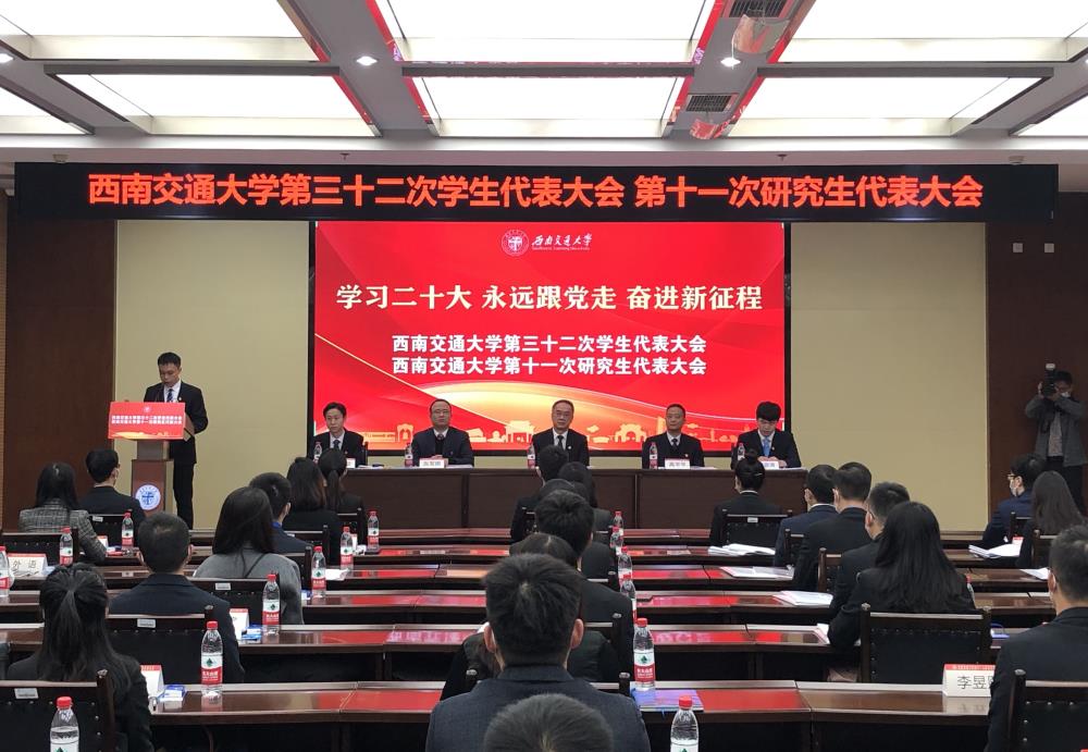 在全党全国各族人民迈上全面建设社会主义现代化国家新征程、向第二个百年奋斗目标进军的关键时刻,在全校师生深入学习贯彻党的二十大精神、深入学习贯彻学校第十五次党代会精神的热烈氛围之中,经学校党委和四川省学联审批同意,西南交通大学第三十二次学生代表大会、第十一次研究生代表大会于2022年11月26日在犀浦校区召开。学校党委副书记余敏明、党委学生工作部部长高平平、校团委书记张军琪、四川省学生联合会执行主席田政涛、成都市学生联合会执行主席李佳聪,学校各二级团组织负责人及各学生会、研究生会指导老师出席大会开幕会。此次大会采取线上线下相结合的方式举办,254名本科生代表、150名研究生代表参加了大会。