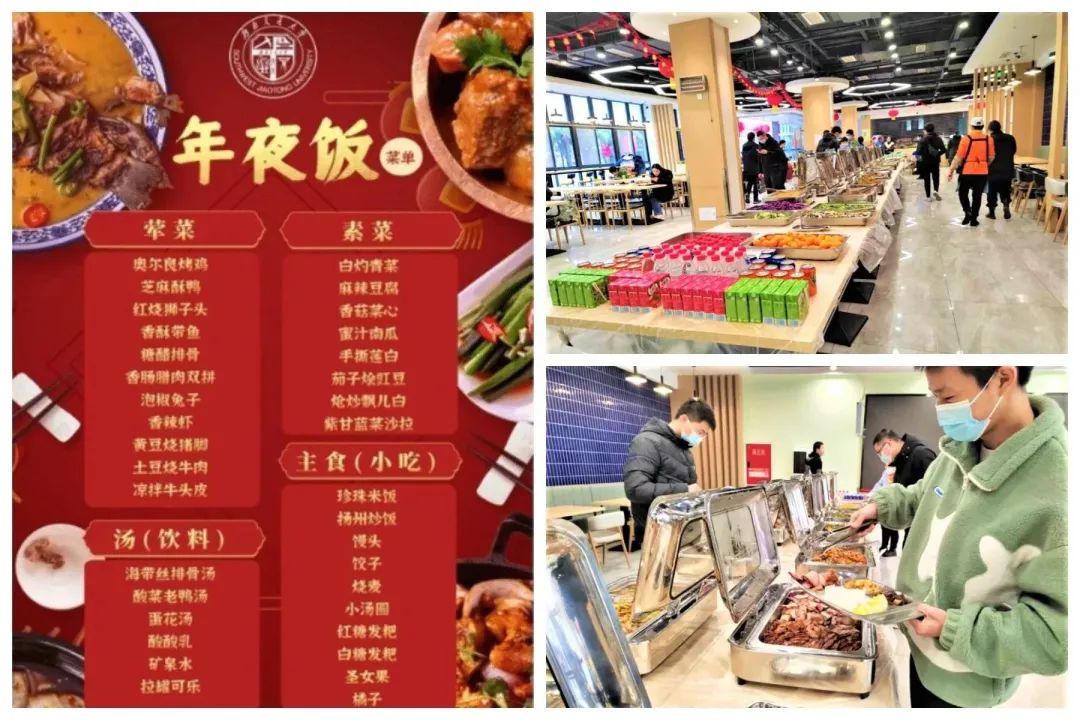 假期前,后基处牵头梳理汇总了后勤系统2023年寒假期间窗口服务值班安排,并通过线上线下各种渠道发布让师生知晓。2023年寒假,由于学习和实习安排等原因,有近400名同学在学校度过春节,为全力做好留校同学饮食服务保障工作,营造喜庆祥和的校园氛围,让留校同学感受到温暖与关怀、舒适平安过大年,成都两校区校区都保证至少有一个食堂开放,还为同学们准备了春节餐券和饺子券,让大家在春节期间吃一顿热热闹闹的年夜饭,过一个欢欢乐乐的喜庆年。