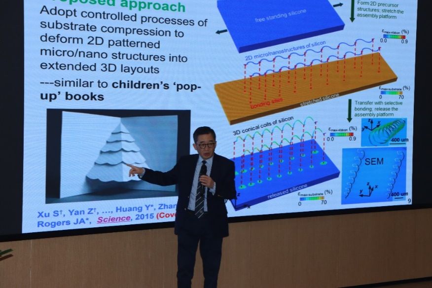 12月11日上午,创源•孙训方大讲堂在西南交通大学犀浦校区图书馆一号报告厅举行,美国国家工程院院士与科学院院士、美国艺术与科学院院士、欧洲科学与艺术学院院士、英国皇家学会外籍院士、加拿大皇家学会外籍院士、中国科学院外籍院士、美国西北大学冠名讲席教授黄永刚作为嘉宾带来主题为“Shape programmable 3D mesostructures and functional devices”的精彩报告。副校长康国政出席论坛。力学与航空航天学院党委书记栗民、执行院长李翔宇等百余位师生参加活动。活动由李翔宇主持。
