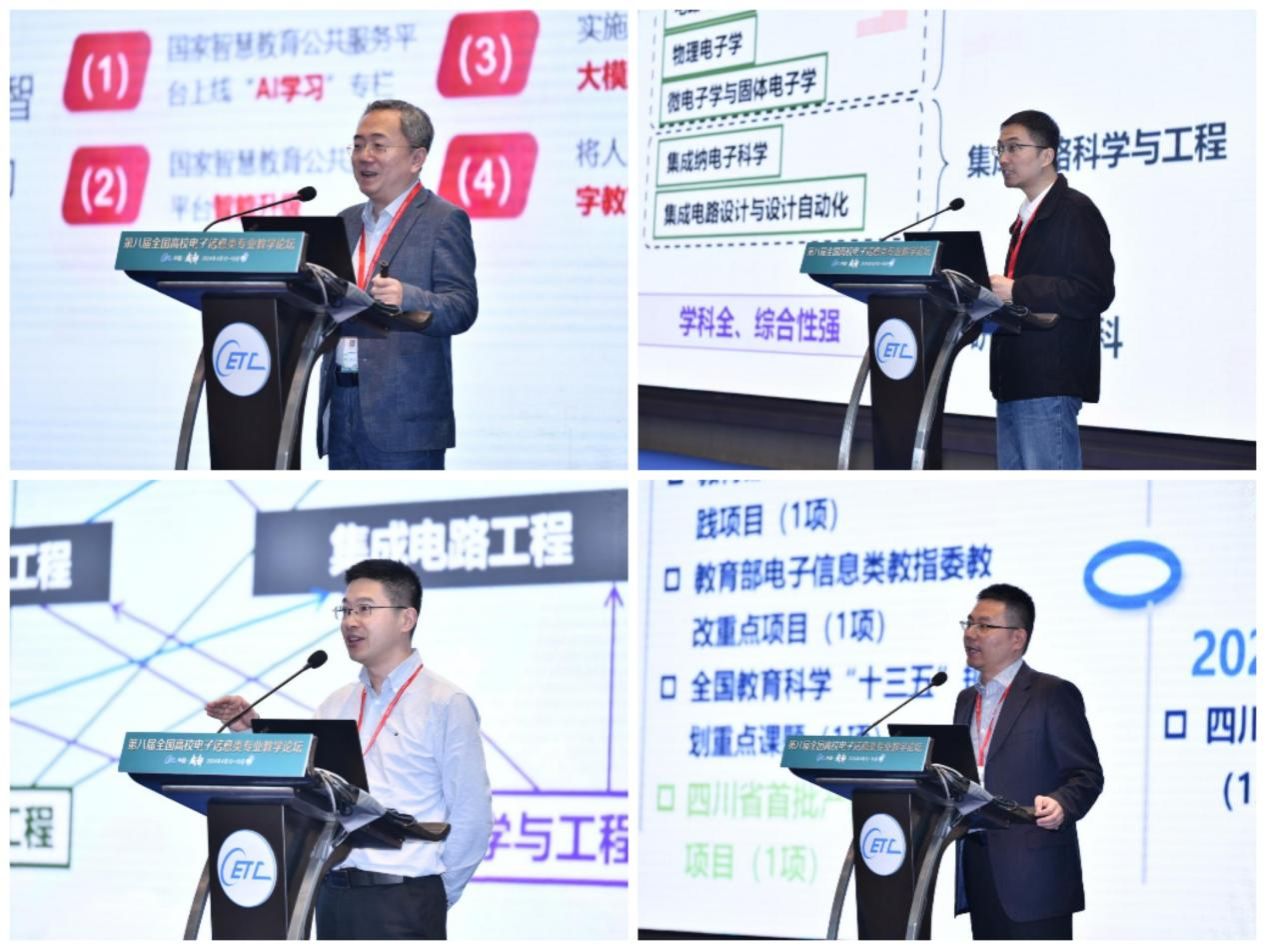 西安电子科技大学苏涛教授分享了题为“新时代一流电子信息类专业建设的思考和实践”的报告,他分析了当前高等教育体系存在的一系列问题,并指出专业建设重点在于“体系合理、执行有效”。清华大学李懋坤教授作题为“电子信息大类人才培养工作介绍”的报告,介绍了清华大学电子信息类专业的课程体系结构、特色实验教学方式、因材施教特色培养项目、电子系人才培养模式等。浙江大学史治国教授作题为“一流专业建设中核心课程内涵优化的探索与实践”报告,指出课程内涵优化在于构建基本体系、新设必修课程以及课程内涵优化,并介绍了学生培养成效。西南交通大学陈民武教授作题为“轨道交通电气信息类一流专业建设与创新实践”的报告,介绍了以轨道交通为行业背景的特色专业建设成果、新质生产力背景下新工科建设、产教和科教双融通育人新范式、第一和第二课堂协同育人新探索。