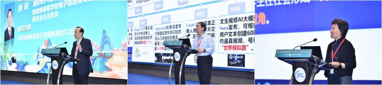 郝跃教授作题为“从两会精神谈电子信息教育的几点认识”的报告。从十四届全国人大二次会议上习近平总书记重要讲话精神出发,郝跃教授分析了国家教育事业的发展形式、面临的挑战,总结了政府工作报告中关于加强高质量教育体系的建设任务,并指出高质量人才是新质生产力发展的关键。何友教授分享了题为“人工智能安全问题研究”的报告,他从人工智能发展简介、人工智能安全问题、人工智能安全技术、人工智能安全战略等四个方面进行了介绍,并表示“今天国家的创新战略、人才优势、巨大市场和强大国力,使得我们有机会成为新时代的推进者”。冯晓云教授作题为“跨学科教学创新,支持面向可持续发展的工程教育”的报告。她谈到,工程教育是可持续发展目标的重要支撑,并阐述了跨学科发展的重要意义,介绍了西南交通大学在跨学科教学创新方面的几个案例。