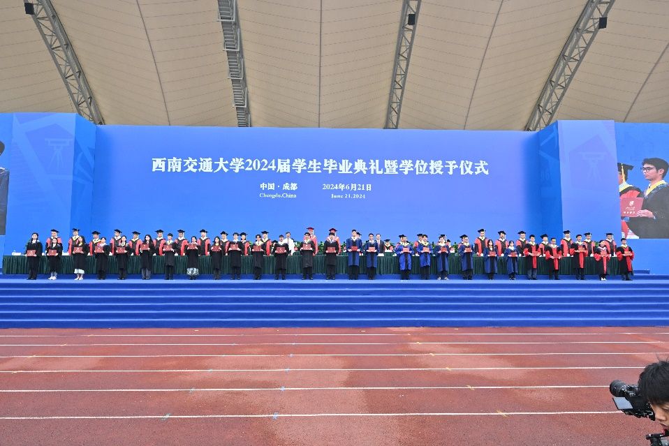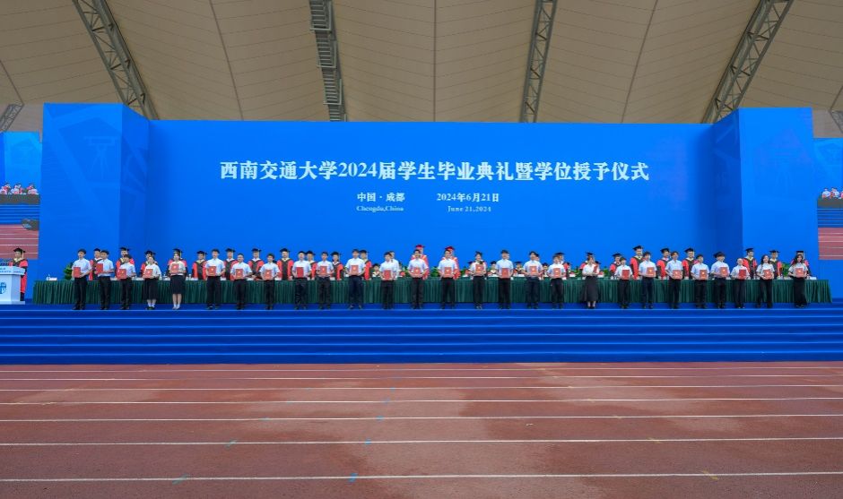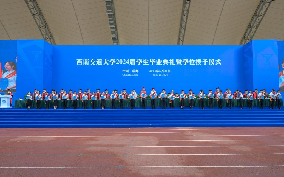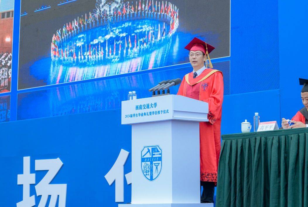 6月21日上午,西南交通大学2024届学生毕业典礼暨学位授予仪式在犀浦校区北区体育场举行。校党委书记余敏明,校长、校学位评定委员会主席闫学东,教育部党建工作联络员石坚,中国科学院院士、校学位评定委员会副主席翟婉明,中国工程院院士、校学位评定委员会副主席何川,全体在校校领导,相关职能部处、各学院(中心、实验室)负责人出席典礼,教师代表、全体2024届毕业生参加典礼。典礼由校党委副书记高平平主持。