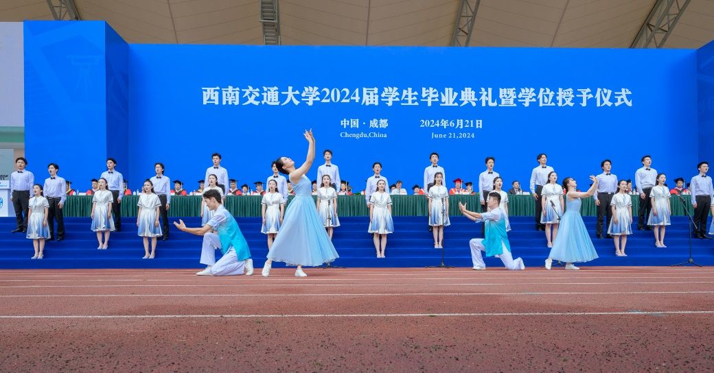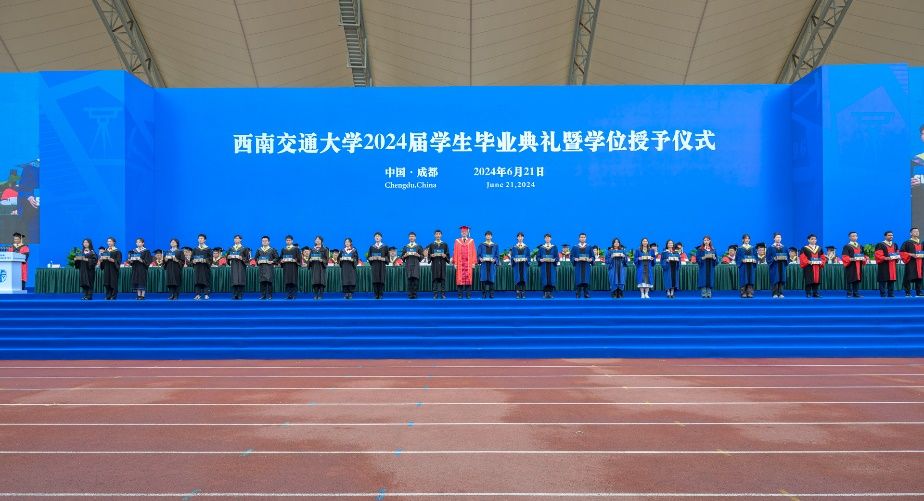 “宜诚笃、宜勤朴,基础坚、事功崇,文轨车书郅大同”,全体在场交大人唱响西南交通大学校歌。至此,学校2024届学生毕业典礼圆满礼成。